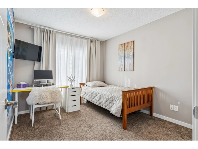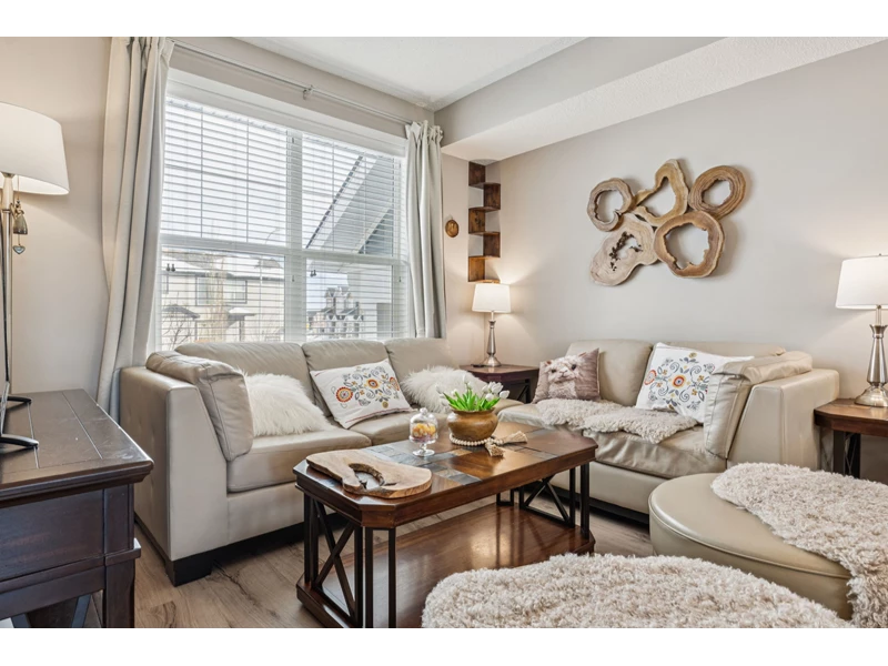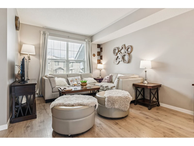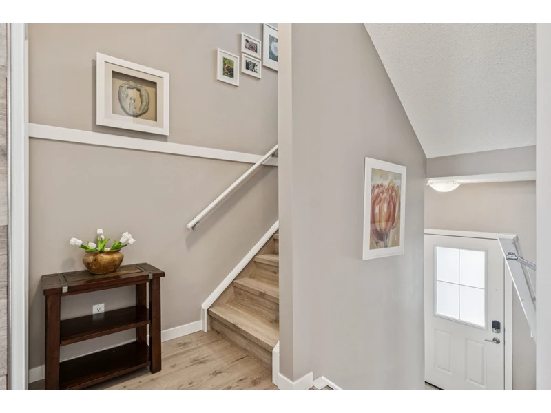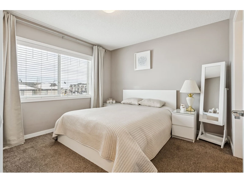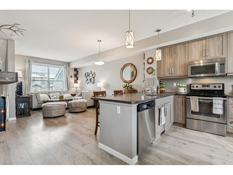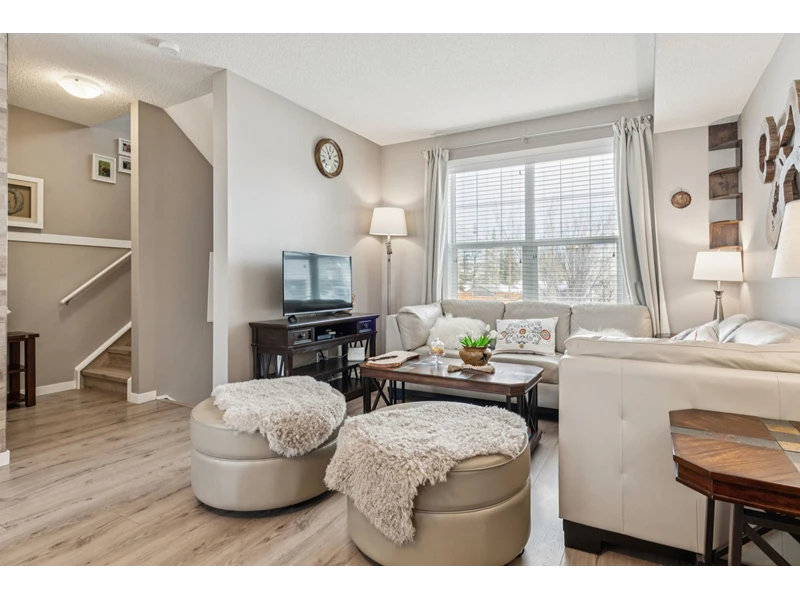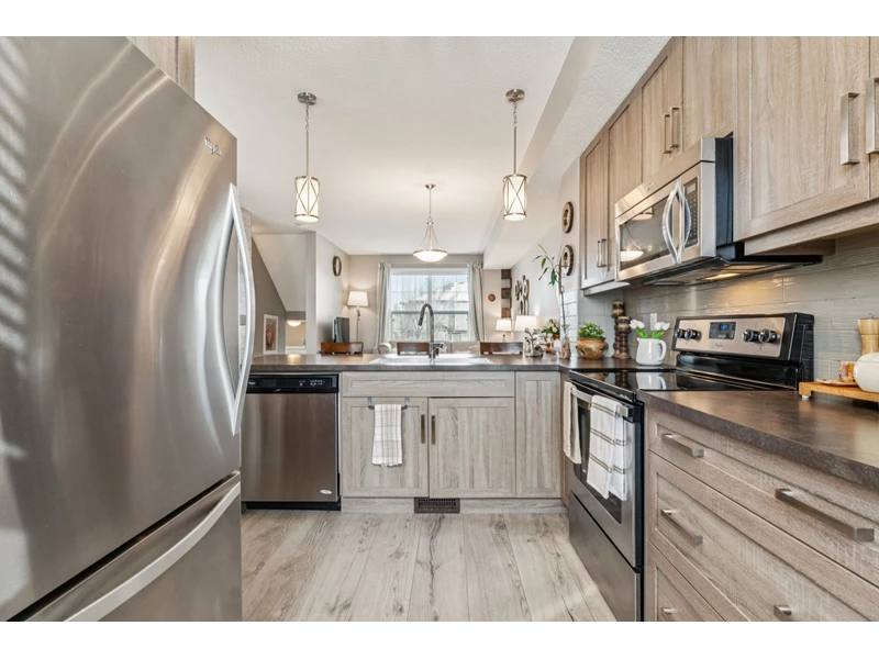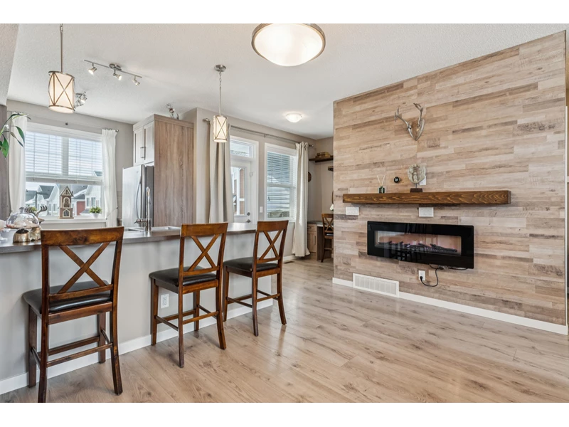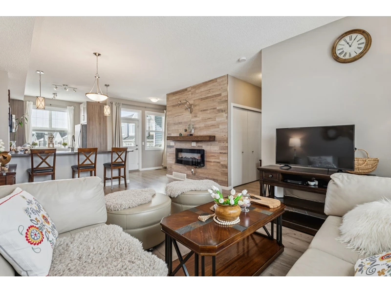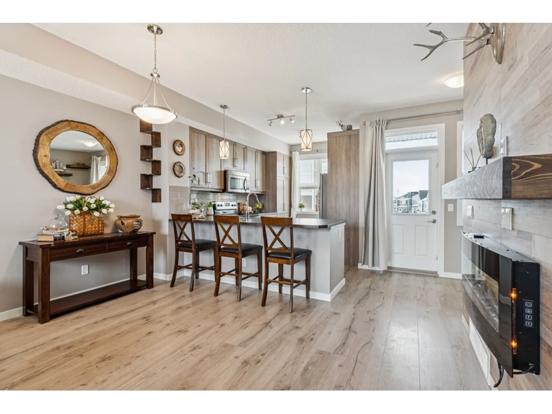 Stylish Jayman townhome offering over 1,500 sq ft of developed living space, a true heated double side-by-side garage, central air conditioning integrated with the HVAC system, and a brand new roof completed in 2025. Welcome to low-maintenance living in the sought-after community of Nolan Hill. The bright open-concept main floor features rich Alpine Oak laminate flooring and a designer kitchen with stainless steel Whirlpool appliances, elegant Shaker cabinetry, and generous counter space. A spacious breakfast nook flows into the inviting living area highlighted by a custom feature wall, mantle, and electric fireplace. This home includes approximately $15,000 in upgrades, including Hunter Douglas blinds, vinyl flooring on the staircase, the custom fireplace feature wall, and smart home features such as a Google Nest thermostat, smart WiFi keypad door lock, and a camera security system. Upstairs are three bedrooms including a comfortable primary suite, two full bathrooms, and convenient second-floor laundry. The lower level offers a versatile den ideal for a home office or recreation space. Enjoy relaxing on the balcony, while the heated double garage provides secure year-round parking and storage. Well-maintained and thoughtfully upgraded, this move-in ready home offers exceptional comfort, style, and convenience.
